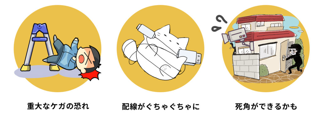 また屋外取付では脚立作業や穴あけが必要になることもあり、転倒やケガのリスクがあり危険な作業と言えます。