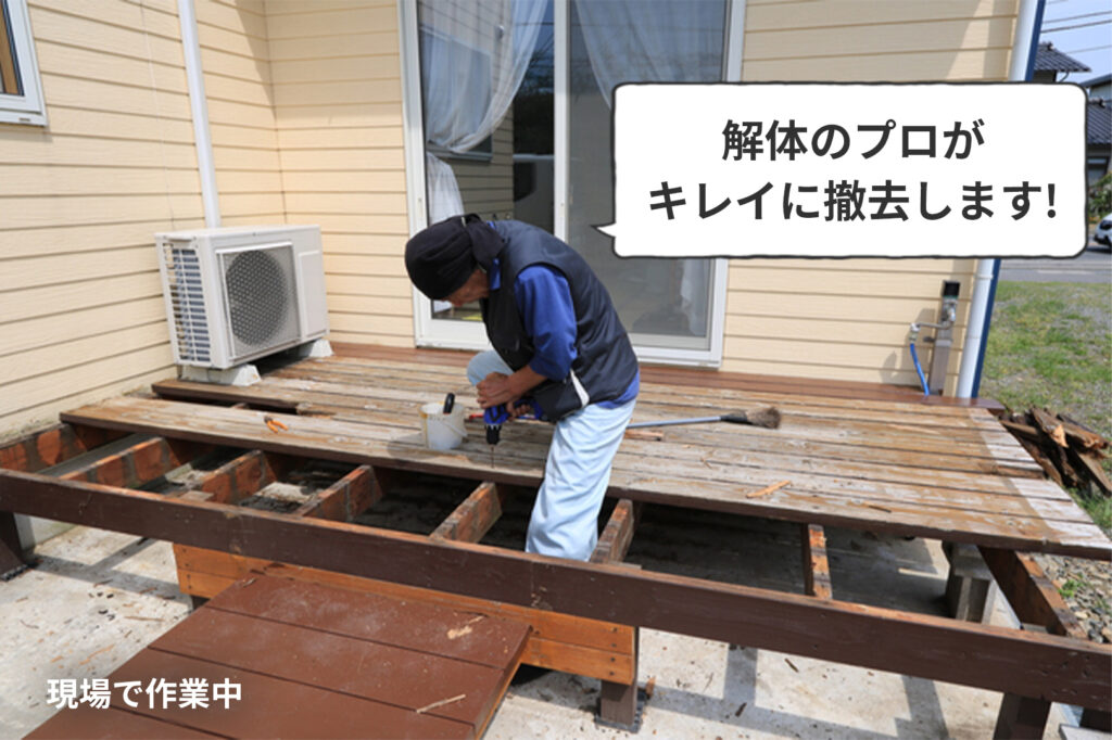 ウッドデッキの規模によっては、DIYで解体してしまった方がコストパフォーマンスが優れているケースも少なくありませんが、初めての作業となるとそれなりの時間がかかる上、誤った工具の使い方による手指の損傷、慣れない姿勢での腰痛、夏場は熱中症などの危険も伴いますので、少しでも不安がある場合は思い切ってプロに任せてしまいましょう。